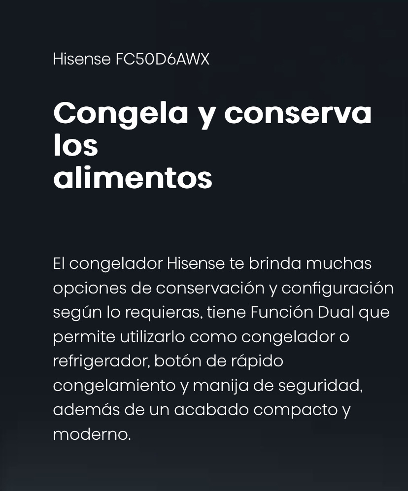 El congelador de 5 pies Hisense te brinda Función Dual que permite utilizarlo como congelador o refrigerador, botón de rápido congelamiento y manija de seguridad. Cuenta con una capacidad de almacenaje de 142 litros.